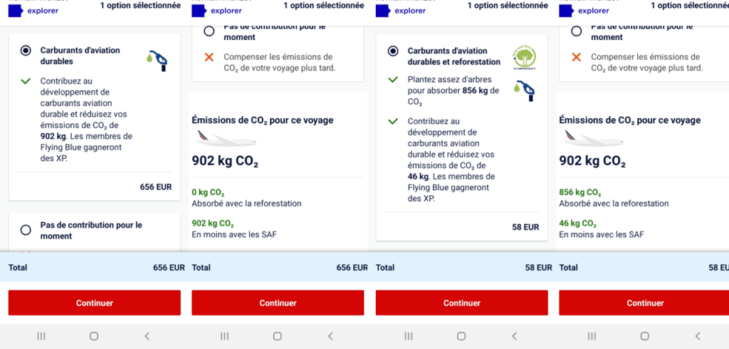 - La compensation est présentée comme une absorption nette des émissions de CO2 du vol ce qui est ici encore inexact car cela dépend de nombreux facteurs qui ne sont pas indiqués dans l’application.